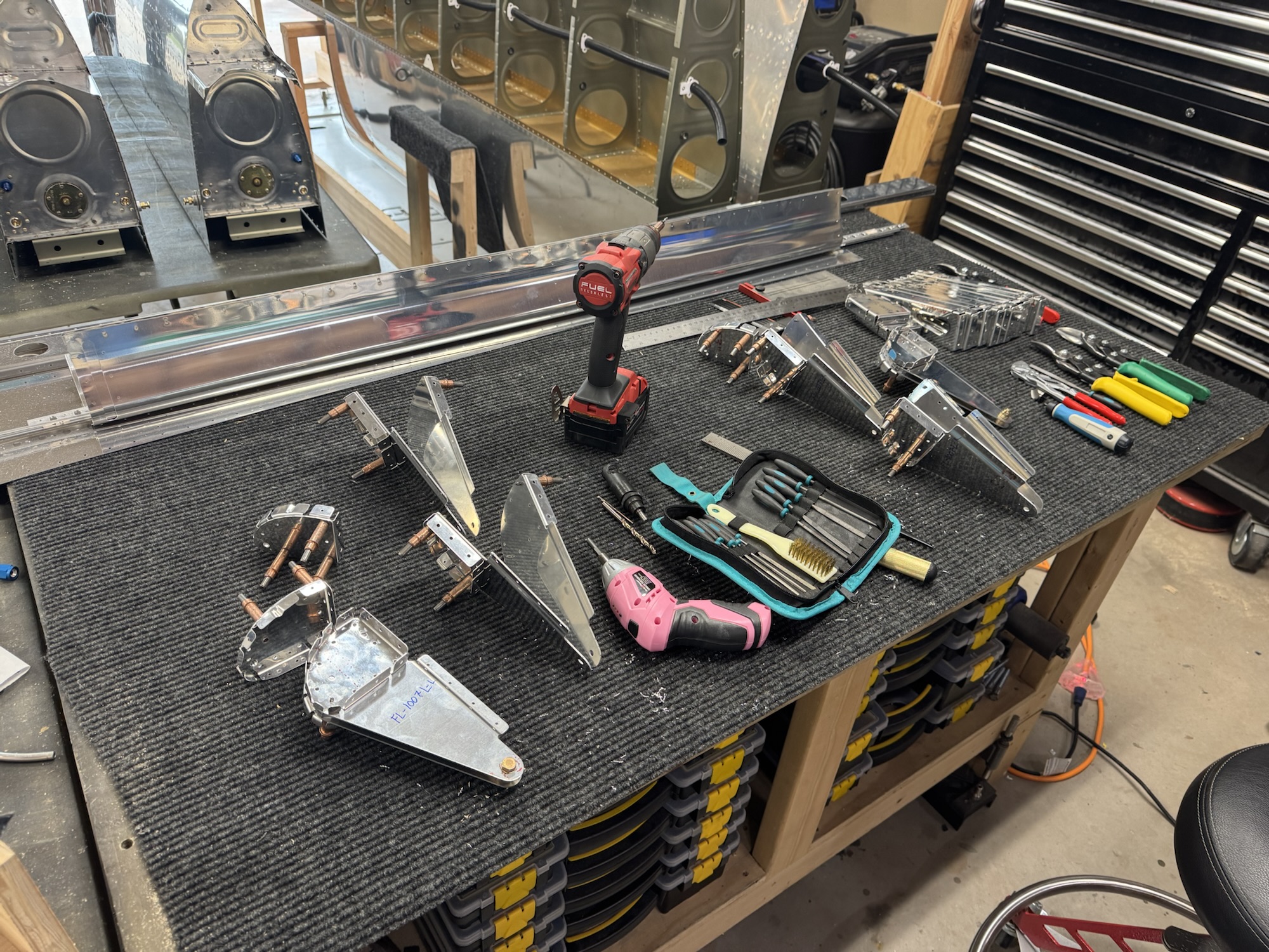 I got quite a bit of the initial work done on the nose ribs and brackets. I did make one mistake that I’ve ordered replacement parts for. The drill press caught the part and forced it off the table and up the drill bit, which elongated the hole. Unfortunately it elongated it WAY too much and this is a critical area where the control bolts will bolt through and I can’t have that. Hopefully the new parts arrive soon or at least while we are gone to Mexico. But I got all of the parts at least cut and match drilled for initial assembly tomorrow.